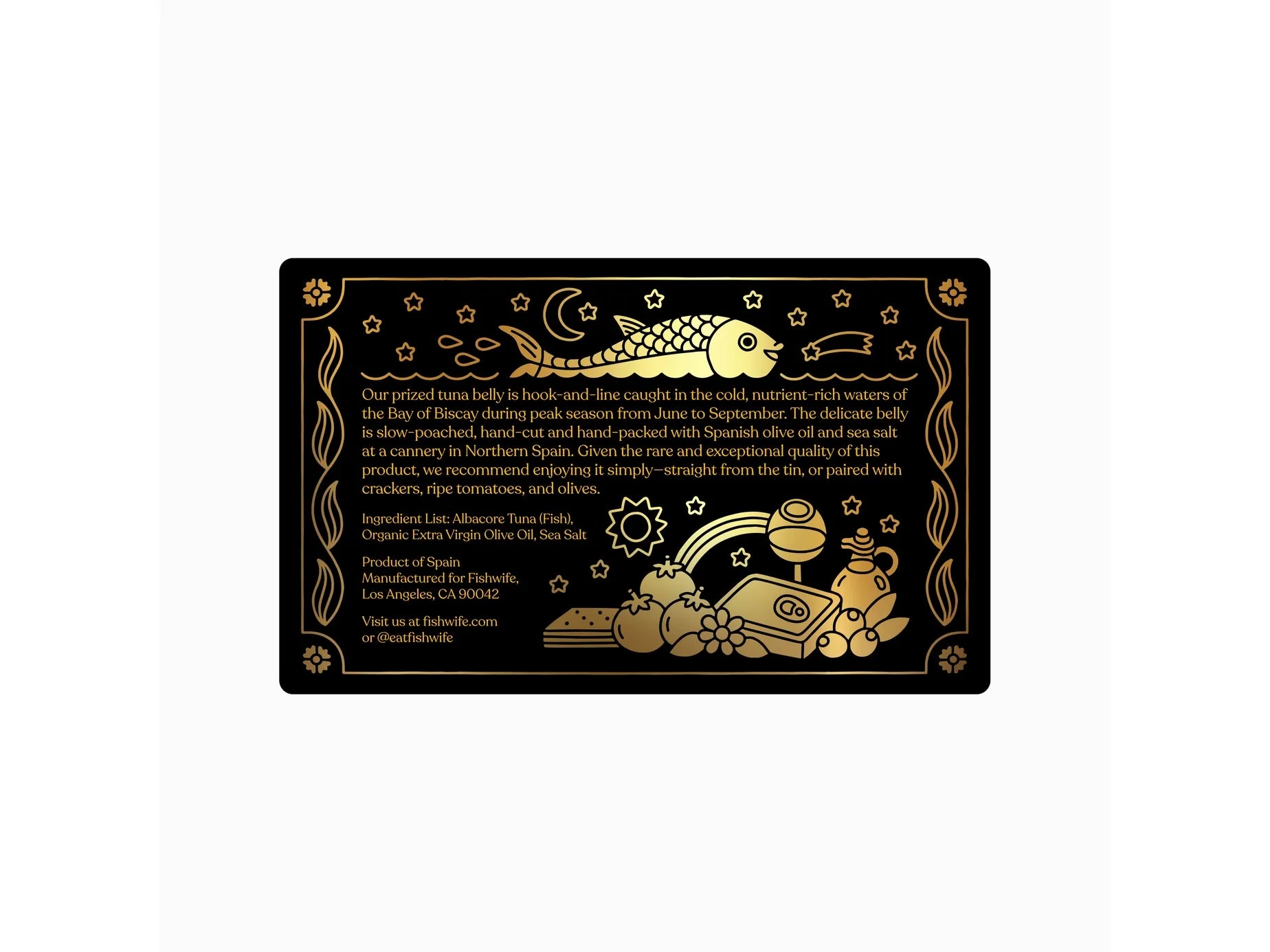Meet Fishwife's newest launch: Albacore Tuna with Spanish Lemon! Our albacore tuna is pole-and-line caught in the Bay of Biscay by small boat fishermen. We source our lemons from the Spanish Mediterranean coast. This tin was packed by hand with 100% Spanish olive oil, fresh lemon juice, and a touch of salt by a cannery located in Northwest Spain, the heartland of the conservas tradition.