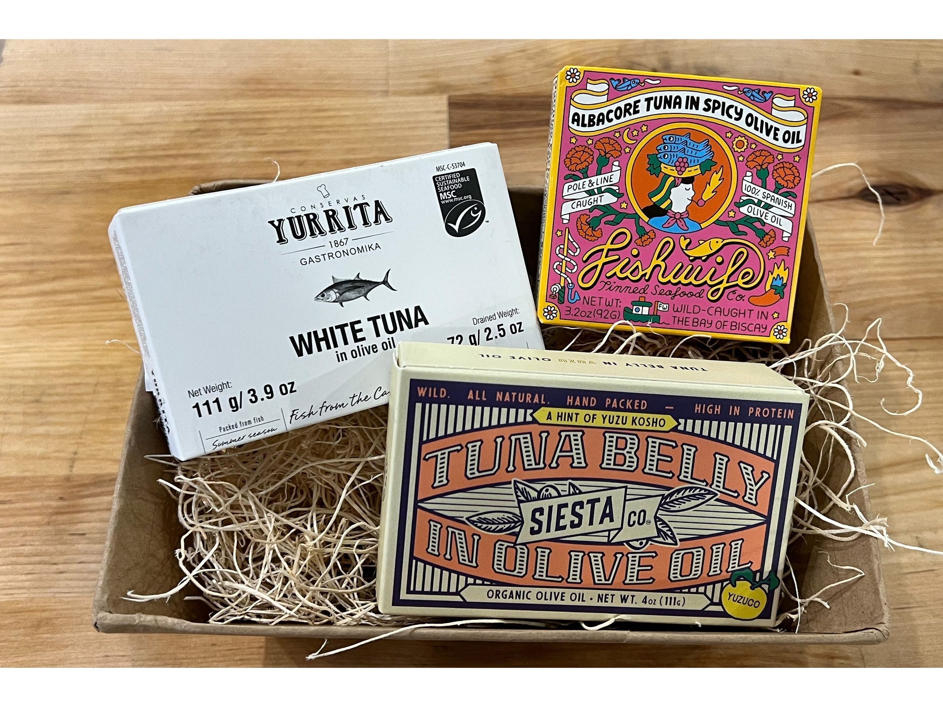 A trio of exceptional tunas, each with its own character and charm. This basket showcases some of our favorite tinned tuna—from bright and spicy to rich and luxurious.